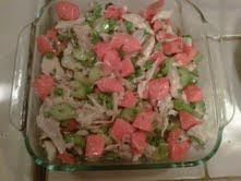 First I needed to poach the chicken. I put the chicken (cut into 8 pieces), carrots, celery, onion, parsley, chicken broth, water, salt and pepper in a large pot.